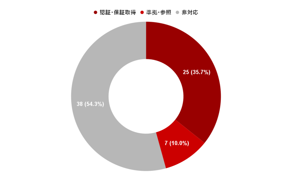 - 人的資本開示のガイドラインである「ISO30414」について、25社(35.7%)の企業がISO30414認証/保証を取得し、準拠/参照まで含めると32社(45.7%)の企業がISO30414を活用していることがわかります。