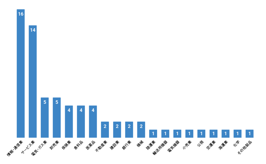 - 業種別では、情報・通信業(16社)、サービス業(14社)、電気・ガス業、卸売業(5社)が上位となっています。