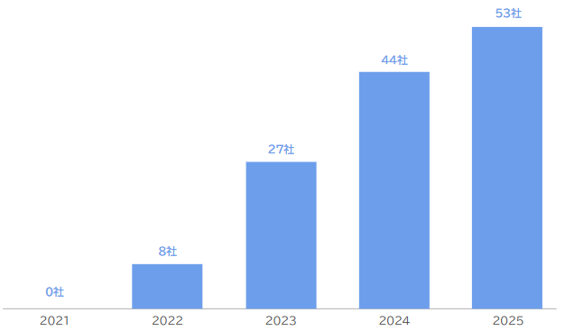 国内においては、2021年には0社だった人的資本レポート開示企業が、2022年は8社、2023年は27社、2024年は44社、2025年は53社に増加しました。